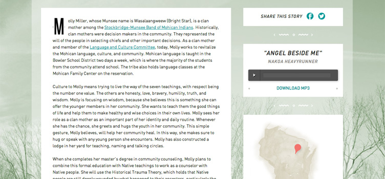 The Ways is an ongoing series of stories from Native communities around the central Great Lakes. This online educational resource for 6-12 grade students features videos, interactive maps, and digital media exploring contemporary Native culture and language. The Ways supports educators in meeting the requirements of Wisconsin Act 31, seeking to expand and challenge current understanding of Native identity and communities. The Ways is a production of Wisconsin Media Lab. New videos, stories, and audio are published on an ongoing basis via ExpressionEngine and automatically pinpointed on the interactive map.